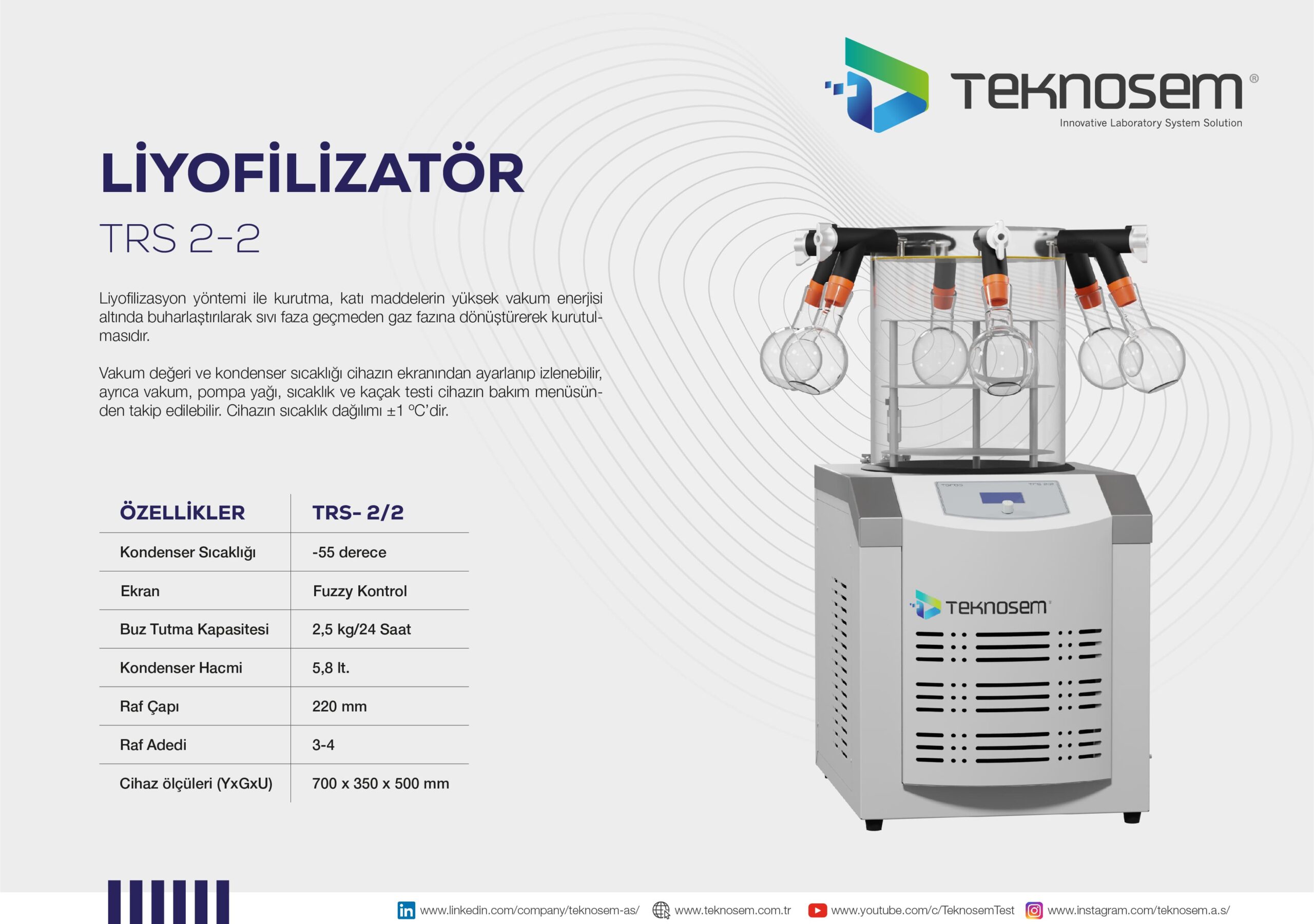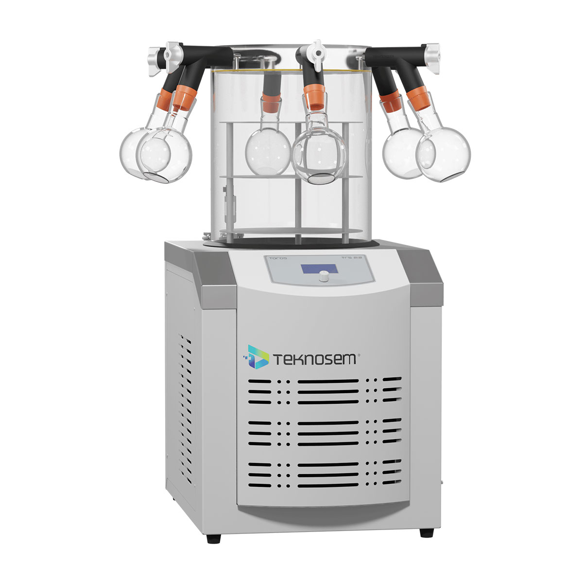 TEKNOSEM’in TRS 2-2 liyofilizatörü, laboratuvar ortamlarında güvenilir kurutma ve dondurma işlemleri için özel olarak tasarlanmıştır. 2,5 kg/24 saat buz tutma kapasitesi, -55 °C kondanser sıcaklığı ve 5,8 litrelik kondansatör hacmiyle donatılmış olan bu cihaz, özellikle biyolojik ve kimyasal numunelerin uzun süre bozulmadan saklanması için idealdir. Vakumlu akrilik odası ve paslanmaz çelik manifold sistemi ile TRS 2-2, kontaminasyona karşı yüksek koruma sağlar. Çevre dostu freon soğutma sistemiyle doğaya zarar vermeden verimli bir işlem sunar.