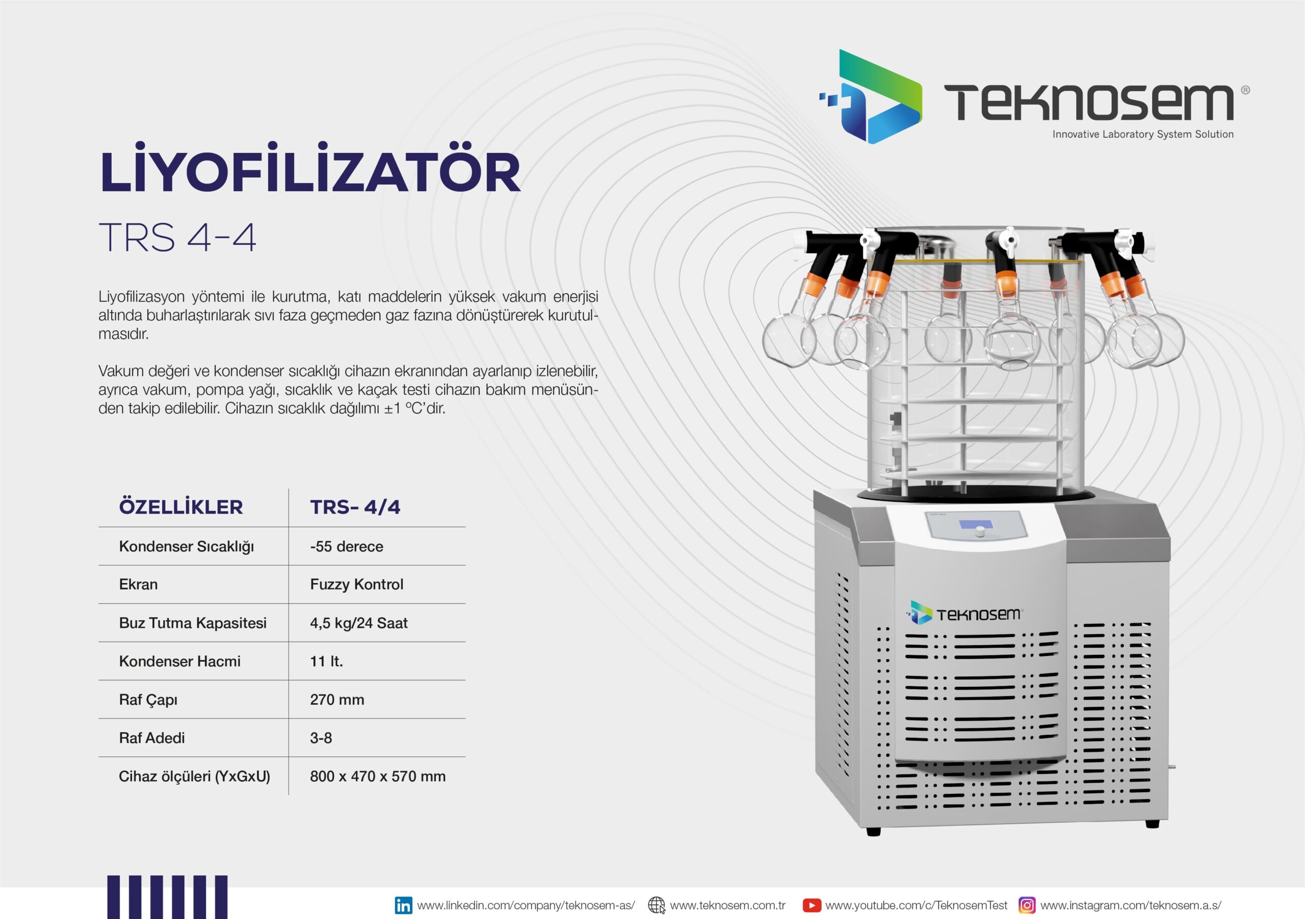 TEKNOSEM’in TRS 4-4 liyofilizatörü, numune kurutma ve dondurma işlemlerinde yüksek performans sunmak için geliştirilmiştir. Cihaz, -55 °C’ye kadar inen kondansatör sıcaklığı, 4,5 kg/24 saat buz tutma kapasitesi ve geniş 11 litrelik kondansatörü ile biyolojik ve kimyasal numunelerin güvenli bir şekilde kurutulmasını sağlar. Paslanmaz çelik manifoldu ve akrilik vakum odası ile kontaminasyon riskini minimuma indirir. Çevre dostu freon soğutma sistemiyle donatılan bu cihaz, gıda, eczacılık, kimya ve biyokimya sektörlerinde güvenilir bir tercih haline gelmiştir.