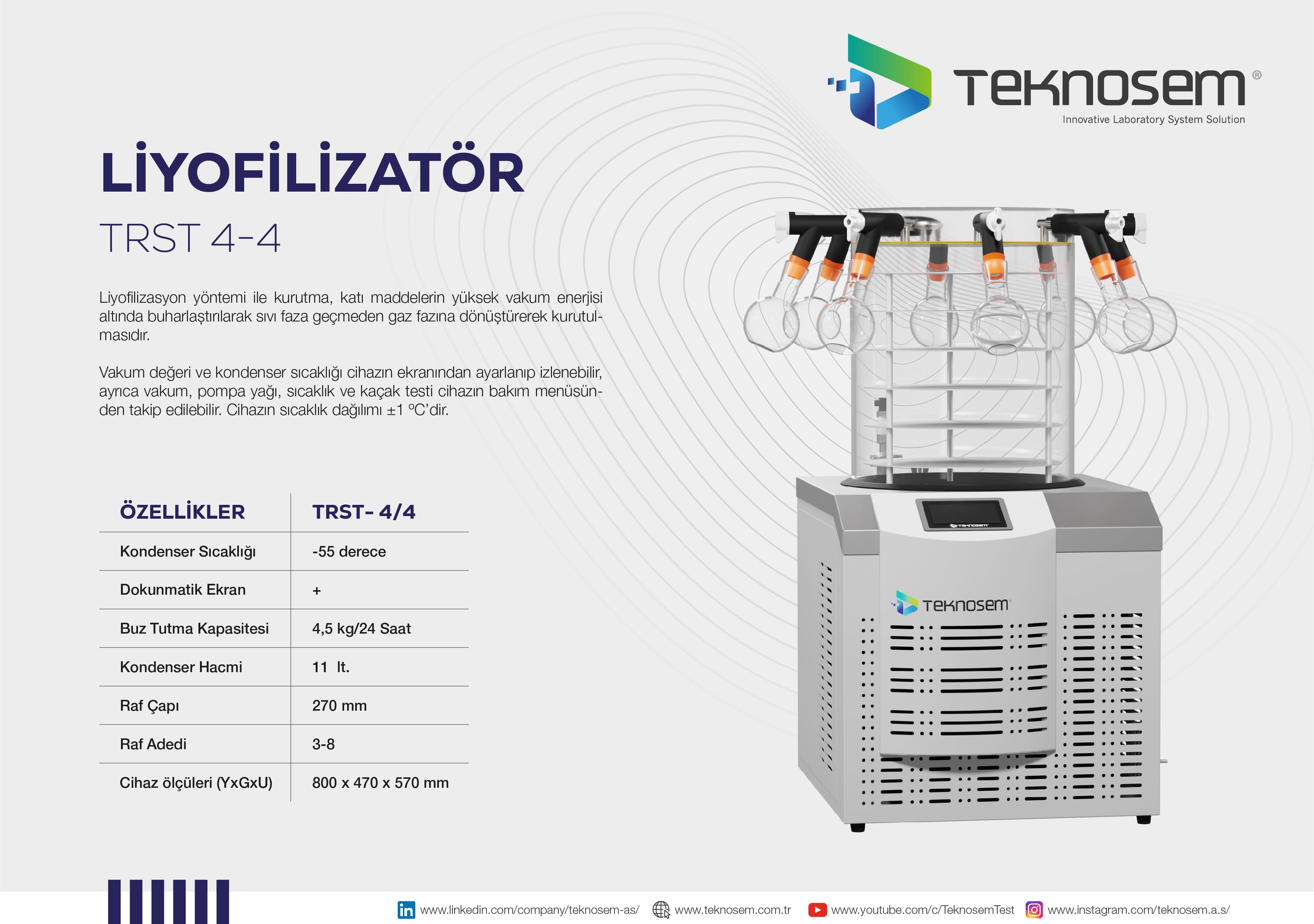 TEKNOSEM’in TRST 4-4 modeli, numune kurutma ve saklama süreçlerini maksimum verimle gerçekleştirmek için tasarlanmış, yüksek kapasiteli bir liyofilizatördür. 4,5 kg/24 saat buz tutma kapasitesi, -55 °C’ye kadar inebilen sıcaklık aralığı ve geniş 11 litrelik kondansatörü ile gıda, kimya, biyoteknoloji ve adli tıp gibi birçok alanda güvenli bir numune saklama imkanı sunar. Paslanmaz çelik kondansatörü ve dayanıklı vakum odası, uzun ömürlü bir kullanım sağlar ve çevre dostu soğutma sistemi ile doğaya zarar vermeden yüksek performans sunar.